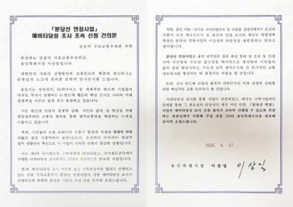 용인특례시(시장 이상일)는 17일 김윤덕 국토교통부 장관에게 ‘분당선 연장사업’과 ‘경기남부광역철도 사업’의 조속한 추진을 요청하는 이상일 시장의 건의문을 전달했다고 18일 밝혔다.이상일 용인특례시장이 김윤덕 국토교통부 장관에게 전달한 '경기남부광역철도 신설 사업' 적극 추진 요청 건의문이상일 용인특례시장이 김윤덕 국토교통부 장관에게 전달한 '경기남부광역철도 신설 사업' 적극 추진 요청 건의문지난 1월 22일 신년 언론브리핑에…