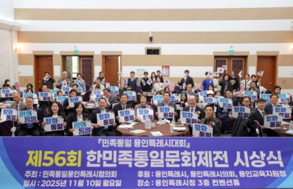 용인특례시(시장 이상일)는 10일 시청 컨벤션홀에서 민족통일 용인특례시협의회 주관으로 ‘민족통일 용인특례시대회와 제56회 한민족통일문화제전 시상식’이 열렸다고 밝혔다. 이상일 용인특례시장이 10일 시청 컨벤션홀에서 열린 민족통일 용인특례시대회에 참석해 축사를 하고 있다.이날 행사는 한반도의 평화와 통일을 주제로 한 글짓기·웹툰·포스터·사진 공모전의 입상작을 시상하고, 유공회원에게 표창을 수여하고자 마련됐다.민족통일 용…