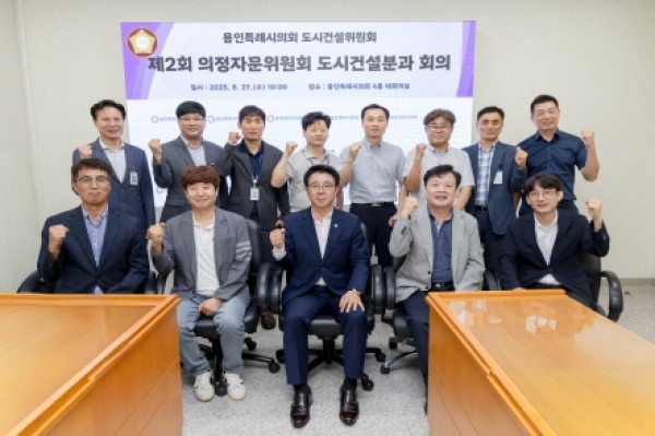 용인특례시의회 의정자문위원회 도시건설분과(위원장 김윤선)는 27일 시의회 대회의실에서 2025년 제2회 의정자문회의를 개최하고, 용인시 도시건설 분야의 주요 현안에 대해 자문과 정책 방향을 논의했다.제2회 의정자문위원회 도시건설분과 회의 참석자들이 기념촬영을 하고 있다.이번 회의는 지난 3월 개최된 제1회 회의에 이어 두 번째로 마련된 것으로, 김윤선 위원장을 비롯해 조경호 도시건설위원회 전문위원, 김용식 ㈜더원 이앤씨 대표,…