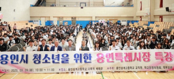이상일 용인특례시장은 9일 오전 용인삼계고등학교 4층 강당에서 '관찰하고 상상하고, 물음을 던져라'라는 주제로 1시간 30분 가량 특강을 했다. 9일 용인삼계고에서 이상일 시장이 특강 후 학생들과 기념사진을 촬영하고 있다 이날 강의엔 용인삼계고 2~3학년 학생 500여 명과 학부모 40여 명이 참석했으며, 1학년 학생들은 각 교실에서 방송으로 강연을 시청했다. 류용걸 용인삼계고 교장은 "이상일 시장은…