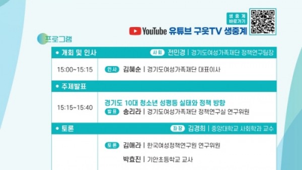 경기도여성가족재단이 29일 오후 3시 경기도여성비전센터에서 10대 청소년들의 성평등 인식 실태를 주제로 정책토론회를 개최한다.경기도+10대+청소년+성평등+실태+토론회+웹자보유튜브 생중계로 개최하는 토론회는 재단이 수행 중인 「경기도 10대 청소년 성평등 실태조사」 연구결과를 공유하고 향후 정책방향을 논의하기 위해 마련됐다.이번 실태조사 연구는 청소년기가 성평등 인식 형성에 중요한 시기라는 점에서 10대 청소년의 ‘성…