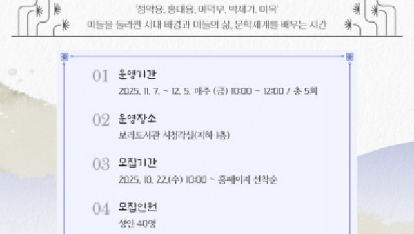용인특례시(시장 이상일) 보라도서관은 오는 11월 7일부터 12월 5일까지 고전 인문학 프로그램으로 ‘2025 역사 탐독회’를 운영한다고 21일 밝혔다.역사탐독회 홍보물이번 강의는 18세기 조선을 대표하는 다섯 명의 인물과 그들을 둘러싼 시대적 배경, 사상적 유산을 중심으로 그들의 삶과…