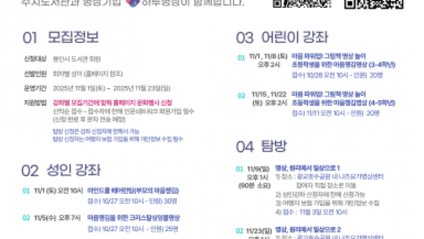 용인특례시(시장 이상일) 수지도서관은 오는 11월 1일부터 23일까지 ‘2025년 길 위의 인문학’ 프로그램 ‘지금 여기, 고요한 마음 산책’을 운영한다고 17일 밝혔다.길위의 인문학 포스터문화체육관광부와 한국문화예술위원회가 주관하는 ‘길 위의 인문학’ 공모사업 선정으로 마련된 이번 프…