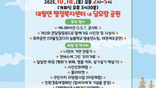 이천시 대월면 주민자치회(회장 정재문)는 오는 10월 18일(토) 오후 2시부터 5시까지 대월면 행정복지센터 내 달모람공원에서 주민과 가족이 함께하는 문화축제 ‘가을에, 대월애(愛)’ 행사를 개최한다. 5. 대월면 가족과 함께하는 피크닉 가을에 대월애 행사 개최&nb…