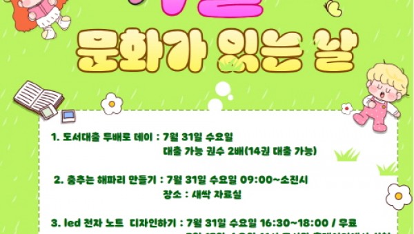 이천시(시장 김경희) 어린이도서관은 ‘7월 문화가 있는 날’(매월 마지막 주 수요일)에 다양한 독서문화 프로그램을 운영하고 있다. 사진자료 (7월 문화가 있는 날 홍보물) 7월 문화가 있는 날에는 1인당 도서 대출 권수가 기존 7권에서 14권까지 확대되는 ▲…