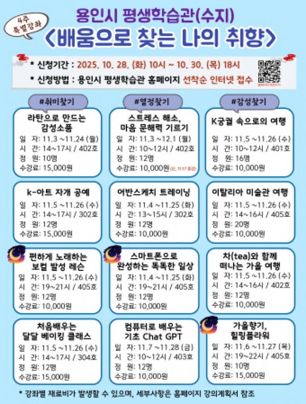 용인특례시(시장 이상일)는 수지에 위치한 용인시 평생학습관에서 28일부터 30일까지 특별강좌 교육프로그램 수강생을 모집한다고 22일 밝혔다.이번 특별강좌은 4주 과정으로, 실생활에 유용한 교육부터 예술·취미 분야까지 다양한 강좌로 구성됐다. 총 12개 강좌에 152명의 수강생을 모집한다. 용인특례시 평생학습관 특별강좌 수강생 모집 안내 포스터주요 프로그램은 ▲취미찾기 분야(라탄으로 만드는 감성소품, K-아트…