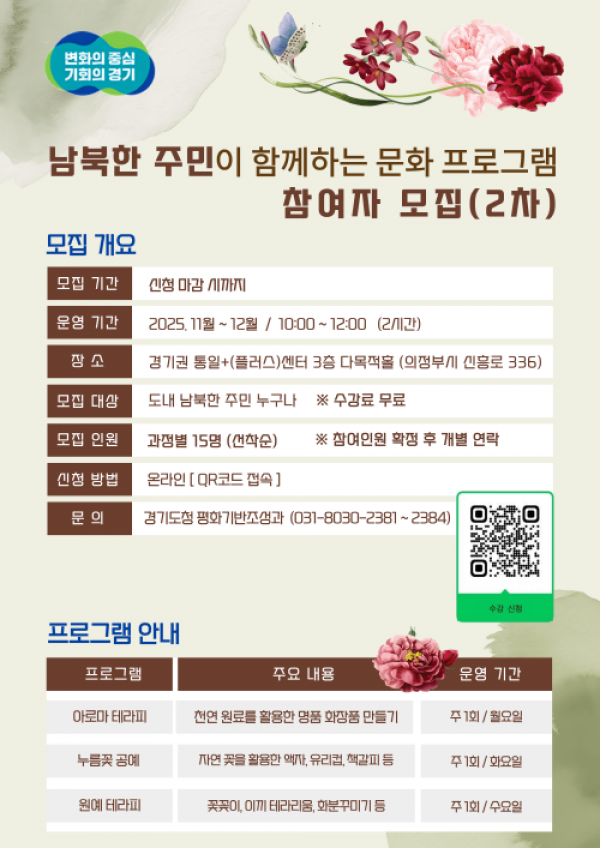 경기도는 10월 22일부터 ‘남북한 주민이 함께하는 문화 체험 프로그램’ 참여자를 모집한다.이번 프로그램은 남북한 주민이 다양한 문화 체험 프로그램을 통해 서로의 문화를 공유하고 상호 소통 및 유대감을 형성하기 위해 마련했다.홍보+포스터10월 27일부터 12월 17일까지 경기권 통일플러스센터(의정부시 신흥로 336)에서 진행된다. 프로그램은 ▲아로마 테라피(월) ▲누름꽃 공예(화) ▲원예 테라피(수) 등 3개 과정으로 운영된다…