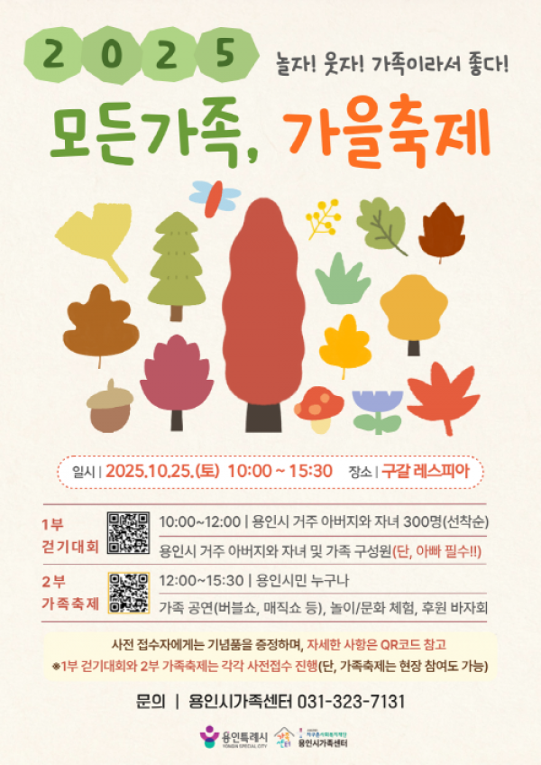 사회복지법인 지구촌사회복지재단 용인시가족센터(센터장 유지영)는 오는 25일 구갈레스피아에서 ‘2025 모든가족 가을축제’를 개최한다. 이번 축제는 1부 ‘아빠와 함께 걷기대회’, 2부 ‘가족축제’로 진행되며, 다양한 가족과 세대 간 소통을 도모하는 화합의 장으로 마련됐다. 1부 ‘아빠와 함께 걷기대회’는 아빠와 자녀를 비롯한 가족이 함께 신갈천 일대를 걸으며 가족 미션을 수행하는 프로그램으로, 가족 구성원 …