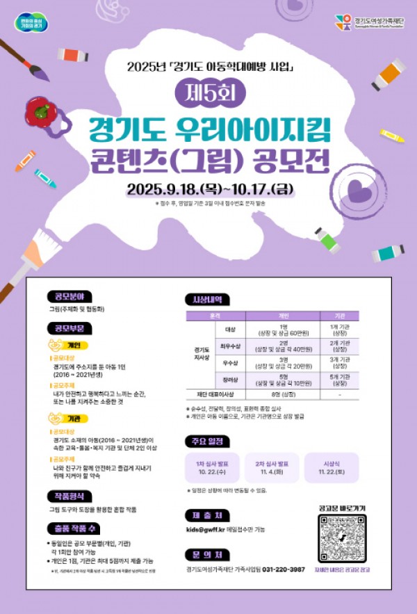 경기도와 경기도여성가족재단은 아동학대 예방의 사회적 공감대를 넓히기 위해 ‘제5회 경기도 우리아이지킴 콘텐츠 공모전’을 개최한다.공모전+포스터공모 주제는 아동의 4대 권리(생존권·보호권·발달권·참여권)를 바탕으로 한 창작 그림으로, 개인 부문은 ‘내가 안전하고 행복하다고 느끼는 순간’ 또는 ‘나를 지켜주는 소중한 것’ 중 하나를 선택해 표현하면 된다. 기관 부문은 ‘나와 친구가 함께 안전하고 즐겁게 지내기 위해 지켜야 할 약속…