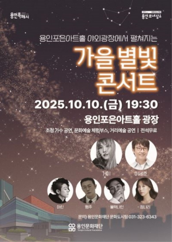용인문화재단(이사장 이상일)은 오는 10월 10일(금) 오후 7시 30분, 새롭게 단장한 용인포은아트홀 야외광장에서 ‘가을 별빛 콘서트’를 개최한다. 이번 공연은 가을밤의 정취 속에서 시민들에게 특별한 추억을 선사하고, 용인의 대표 광장형 축제를 알리기 위해 마련됐다.[포스터]용인문화재단,‘가을 별빛 콘서트’10월 10일 개최 ‘가을 별빛 콘서트’에는 가수 거미, 유리상자 이세준, 힙합 아티스트 행주·마린·블랙나인, …