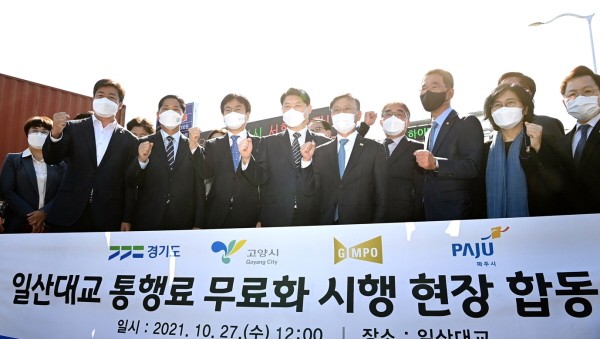 일산대교가 경기도의 공익처분 시행으로 27일 정오를 기점으로 전면 무료화한 가운데, 이날 도는 김포시, 고양시, 파주시와 함께 ‘일산대교 통행료 무료화 시행 현장 합동 발표 행사’를 열었다. 일산대교 현장에서 열린 이날 행사에는 이한규 경기도 행정2부지사와 이재준 고양시장, 정하영 김포시장, 고광춘 파주부시장, 김주영 국회의원, 박상혁 국회의원 등이 참석했다. 이한규 행정2부지사는 이날 축사를 통해…