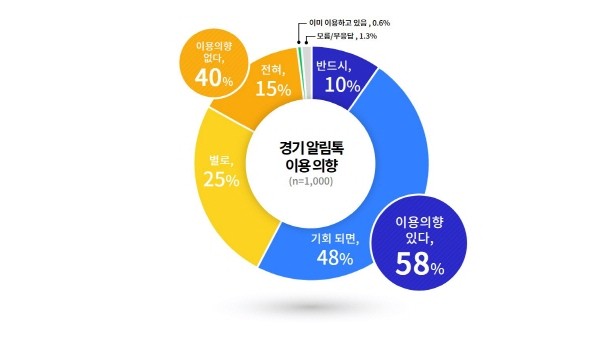 ‘경기알림톡’ 등 경기도에서 제공하는 마이데이터 서비스에 대해 경기도민 10명 중 6명이 ‘이용 의향이 있다’고 밝혔다. 데이터 주권과 마이데이터 서비스 활성화가 일상에 미치는 영향에 대해서도 도민 절반가량은 ‘긍정적’인 반응을 보였다. [그래픽1]+경기알림톡+이용의향 경기도는 지난달 11일 도민 1,000명을 대상으로 ‘데이터 주권과 마이데이터’를 주제로 여론조사를 실시했다고 4일 밝혔다. ‘데이터 주권’…