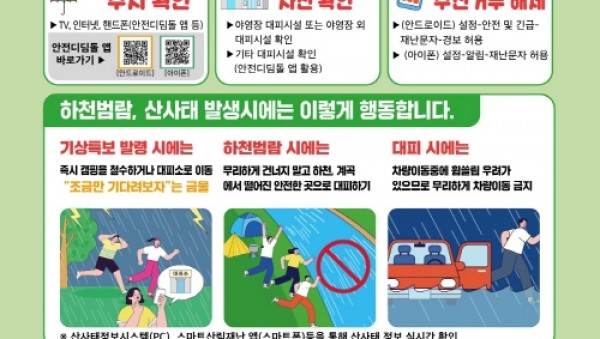 경기도는 예측이 어려운 기상상황에 대비해 야영장 이용객의 신속한 대피를 돕기 위한 행동요령 홍보물 10만 8천 부를 제작해 야영장 등에 배포했다고 22일 밝혔다.포스터(7)산악지대나 하천 인근에 위치한 야영장은 기상이변으로 인한 산사태, 하천 범람 등에 취약하다. 이번에 제작된 행동요령은 이러한 재난 상황에서 인명피해를 예방하기 위해 ‘사전 준비’와 ‘사전 대피’에 초점을 맞춰 야영장 이용객의 적극적인 참여를 유도하는 내용을 …