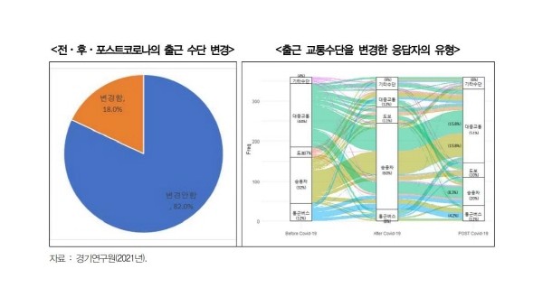 경기도민 10명 중 2명은 코로나19 상황에 따라 출근 교통수단을 변경한다는 조사 결과가 나왔다. 감염병 우려로 승용차를 주로 이용했으나 ‘포스트 코로나’ 시대에는 대중교통을 이용하겠다는 것인데, 이를 위한 대책으로는 ‘차내 혼잡률 완화’를 가장 많이 꼽았다. 경기연…