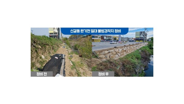 용인시 기흥구는 신갈동 388-892번지 일원 완기천 일대 불법경작지 정비를 완료했다고 30일 밝혔다.기흥구 신갈동 완기천 일대 정비 전 후 그동안 구는 완기천 일대에 안내문 및 현수막 등을 설치해 하천 경사지 등에 농작물 재배 금지를 권고해왔으나 고질적인 불…