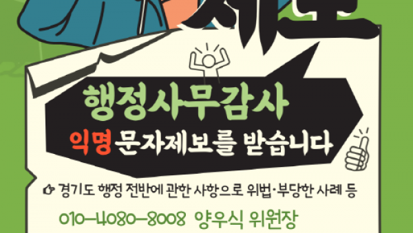 경기도의회 양우식 의회운영위원장은 의회운영위원회 행정사무감사 신고제보센터(이하 ‘신고센터’)에 다양한 분야의 제보가 잇따른다고 밝히며 도민들의 적극적인 제보를 독려했다. 241024 양우식 의원, 행감신고센터에 갑질횡령 등 익명제보 잇따라 경기도의회 운영위원회는 1…