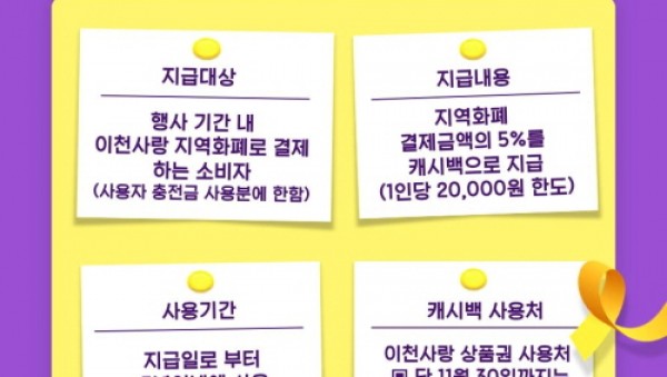 이천시(시장 김경희)는 행정안전부 주관 ‘2025 코리아그랜드페스티벌(KOREA GRAND FESTIVAL)’에 맞춰 지역화폐 이용을 촉진하고 지역 상권을 활성화하기 위한 ‘이천사랑 지역화폐 캐시백 5% 이벤트’를 추진한다고 밝혔다.2. 이천사랑지역화폐 캐시백 5% 이벤트 누리자 코리아…