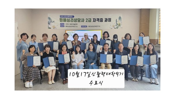 이천시 농업기술센터(소장 이태영)가 주최하고 예교상담교육연구소(대표 손진)가 주관한 ‘이천신활력대학 제9기 원예심리상담사 2급 자격증 과정’이 지난 10월 17일, 이천신활력대학 교육장에서 수료식을 열고 8주간의 교육 일정을 성공적으로 마무리했다.8. 이천 신활력대학 제9기 원…
