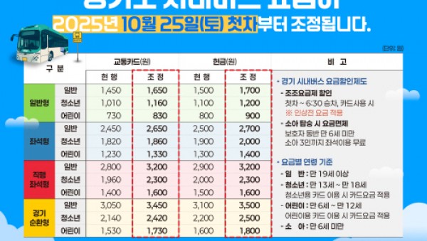 경기도가 어려운 도내 버스업계 경영 상황을 개선하고 안정적인 대중교통 서비스 제공을 위해 25일 첫차부터 시내버스 요금을 조정한다.보도자료+홍보+이미지시내버스 요금 조정은 2019년 9월 이후 6년 만으로 일반형·좌석형은 각 200원, 직행좌석형·경기순환형은 각 400원 인상한다.&nb…