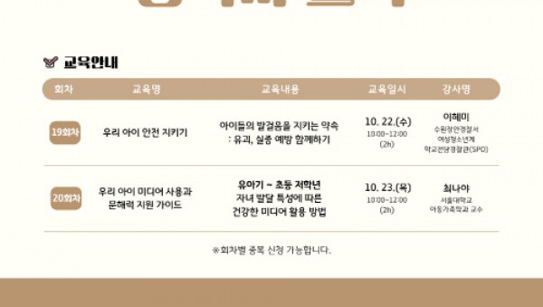 경기도여성가족재단은 오는 22일 오전 10시부터 12시까지 도내 양육자와 예비부모를 대상으로 실종·유괴예방 온라인 교육을 실시한다.양육자교육+웹포스터‘우리 아이 안전지키기’라는 이름으로 열리는 이번 교육은 최근 아동 대상 유인·유괴 범죄가 사회적 문제로 대두된 가운데, 양육자들이 일상 …