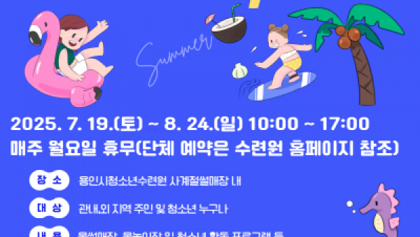 (재)용인시청소년미래재단(이사장 : 이상일) 용인시청소년수련원은 여름 시즌을 맞아 7월 19일부터 8월 24일까지 하계 체육시설인 물놀이장 물썰매장(에버슬라이드)을 개장한다고 밝혔다. 이번 시설은 무더위를 식히고 즐거운 추억을 만들 수 있는 공간으로, 지역 주민과 청소년들의…