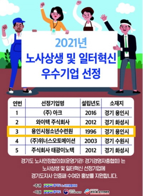 용인시청소년수련원 2021년도 노사상생 및 일터혁신 우수기업 선정