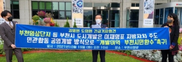 경기도의회 건설교통위원회 김명원 위원장(더불어민주당, 부천6)은 19일(화)경기도의회 부천상담소에서 관계시민단체 및 기자들과 정담회를 갖고, 부천시청 앞에서 영상문화산업단지 등 부천시 도시개발, ‘지방자치단체 주도 민․관 합동 공영개발 방식으로 하여 개발이익을 부천시민에게 환수’ 할 것을 촉구하는 성명을 발표했다. 김명원 의원, ‘지방자치 주도 공영개발 방식으로 개발이익 주민에게 환수’ 강조 부천영상문화산업…