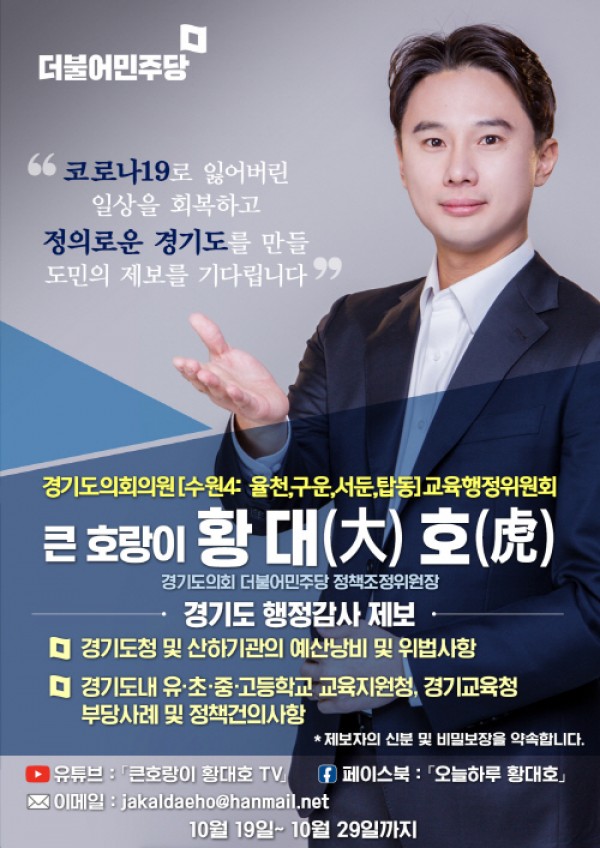 경기도의회 교육행정위원회 황대호 의원(더불어민주당, 수원4)은 2021년도 행정사무감사를 약 보름가량 앞두고 경기도와 경기도교육청으로부터 위법 또는 부조리한 처분을 받은 전력이나 현재 시행 중인 정책사업의 예산 낭비 등 부당행위 신고, 정책개선 제안 등을 오는 10월 29일(금)까지 공개 제보받는다고 알려왔다. 경기도의회 황대호 의원 웹포스터(행정사무감사 제보) 황대호 의원은 2020년 경기도교육청 행정사무…