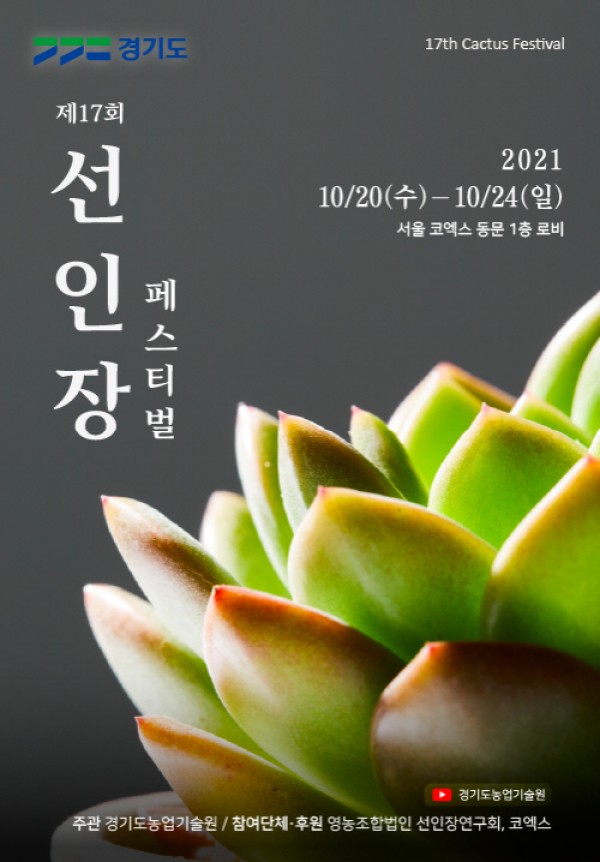 경기도농업기술원 선인장다육식물연구소가 10월 20일부터 24일까지 5일간 서울 코엑스 동문1층 로비에서 ‘제17회 선인장페스티벌’을 개최한다. 선인장페스티벌+홍보포스터1 선인장페스티벌은 선인장과 다육식물의 우수성 홍보와 화훼산업 발전을 위해 매년 열리고 있다. 올해는 ‘선인장! 희망을 꽃 피우다(Cactus! Blossom the Hope!)’를 주제로 경기도 농기원이 주관하고 영농조합법인 선인장연구회가 참…
