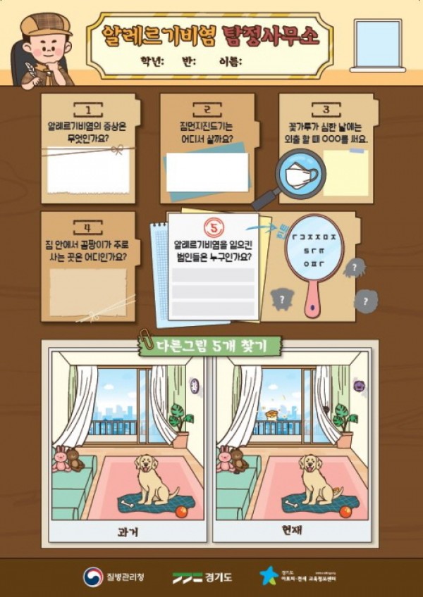 경기도와 경기도 아토피·천식 교육정보센터(센터장: 분당서울대학교병원 알레르기내과 장윤석 교수)가 개발한 신개념 교육자료 ‘알레르기비염 탐정사무소’가 큰 호응을 얻고 있다.7일 도에 따르면, ‘알레르기비염 탐정사무소’는 알레르기비염의 증상과 원인, 예방을 위한 환경관리 방법에 대해 ‘알탐정’과 함께 추리놀이를 하며 쉽고 재미있게 배워볼 수 있는 초등학생 대상 맞춤형 교육자료다.알레르기비염 탐정사무소 활동지알레르기비염에 걸린 캐…