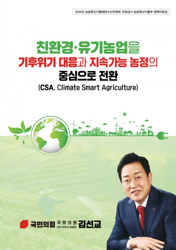 국회 농림축산식품해양수산위원회 김선교 의원(국민의힘, 경기 여주시‧양평군)은 농림축산식품부와 해양수산부 국정감사를 맞아 과 등의 정책자료집을 각각 발간했다고 전했다지난 14일 농림축산식품부 국정감사 당시 발간한 정책자료집은 우리 농업은 기후위기와 생물다양성 상실이라는 전 지구적 도전에 직면해 있다며, 이를 해소하기 위해 ▲농업생태학적 관점에서의 생산체계 전환 및 유기농업의 비중 확대, ▲유기농산물의 생산‧가공‧유통 기반 강…