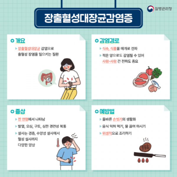 장출혈성대장균 감염증은 주로 덜 익힌 소고기, 오염된 식품·물을 통해 전파되며, 감염 시 복통, 구토, 발열, 설사(혈변 포함) 등의 증상이 나타난다. 대부분은 수일 내 회복되지만, 면역력이 약한 10세 미만의 소아나 고령자는 용혈성요독증후군(HUS) 같은 중증 합병증으로
