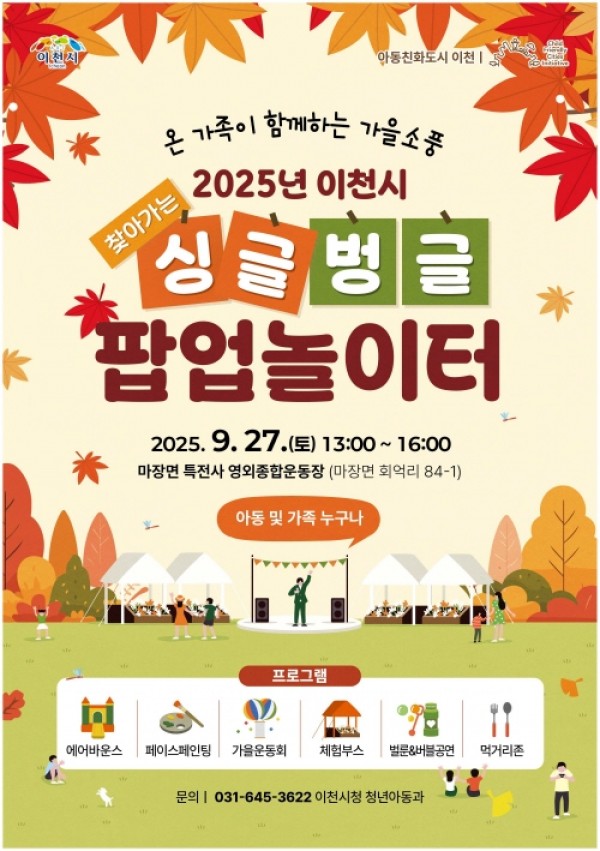 이천시(시장 김경희)는 아동친화도시 놀이문화 확산과 아동의 놀 권리 보장을 위해 「찾아가는 싱글벙글 팝업 놀이터 ‘가을소풍’」 행사를 오는 9월 27일(토) 마장면 특전사 영외종합운동장에서 개최한다고 밝혔다. 5. 이천시 2025년 찾아가는 싱글벙글 팝업 놀이터 개최 「찾아가는 싱글벙글 팝업 놀이터」는 계절별 콘셉트로 진행되는 가족 참여형 놀이문화 프로그램으로, 올해 총 3회에 걸쳐 운영…