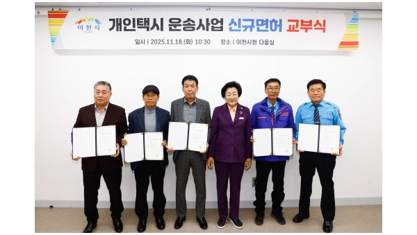 이천시(시장: 김경희)는 지난 18일 시청 다올실에서 개인택시운송사업 신규 면허증 교부식을 개최하고, 심사를 통해 최종 선정된 5명의 대상자에게 면허증을 전달했다고 밝혔다.1. 이천시 2025년 개인택시운송사업 5대 신규 면허 발급 이는 지난 8월 경기도의 ‘제5차 택시 총량 고시’에 따른 후속 조치로, 해당 고시는 2025년부터 2029년까지 적용된다. 이천시의 적정 택시 총량은 기존 518대에서 15…