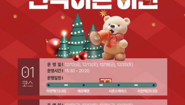 이천시(시장 김경희)는 오는 12월 12일부터 20일까지 매주 금·토요일, 겨울철 야간 관광의 매력을 담은 기획 시티투어 ‘따뜻한 하루 반짝이는 이천, 12월 시티투어’를 운영한다. 3. 이천시 따뜻한 하루 반짝이는 이천 12월 시티투어 운영 이번 12월 시티투어는 온천과 예술, 크리스마스 야경을 핵심 테마로 구성하여 차가운 겨울 속에서도 따뜻함과 설렘을 동시에 느낄 수 있는 이천만의 겨울 여행…
