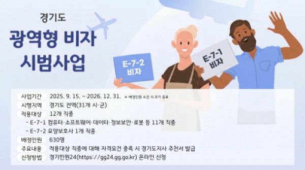 경기도가 IT, 돌봄 등 외국인 전문인력 유치를 위한 경기도 맞춤형 비자 제도를 도입한다. 도는 15일부터 ‘경기도 광역형 비자 시범사업’을 시행해 기업의 인력난 해소와 외국인의 안정적인 지역 정착을 지원한다고 밝혔다.인포그래픽(1)경기도 광역형 비자 시범사업은 경기도지사 명의의 추천서를 통해 외국인이 특정활동(E-7) 비자를 신청할 수 있도록 지원하는 제도다. 법무부와 협력해 지역 맞춤형 제도로 설계됐으며, 기업은 필요한 인…