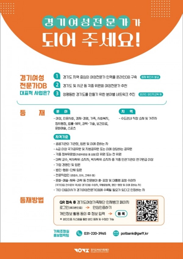 경기도여성가족재단이 도내 여성전문가들의 정책과정 참여와 교류협력을 위한 ‘경기 여성전문가DB’ 신규 등재자를 모집한다.여성전문가DB는 경기도내 분야별 여성전문가 인력풀을 구축하고 도 및 시군 각종 위원회에 추천하기 위한 사업이다. 2025년 현재 경제․경영, 법률, 과학기술 등 총 11개 분야 2,500여 명이 온라인DB에 등재돼 있다.여성전문가+등재+안내+홍보지재단은 올해부터 등재자들을 대상으로 한 온라인 성인지 교육을 분기…