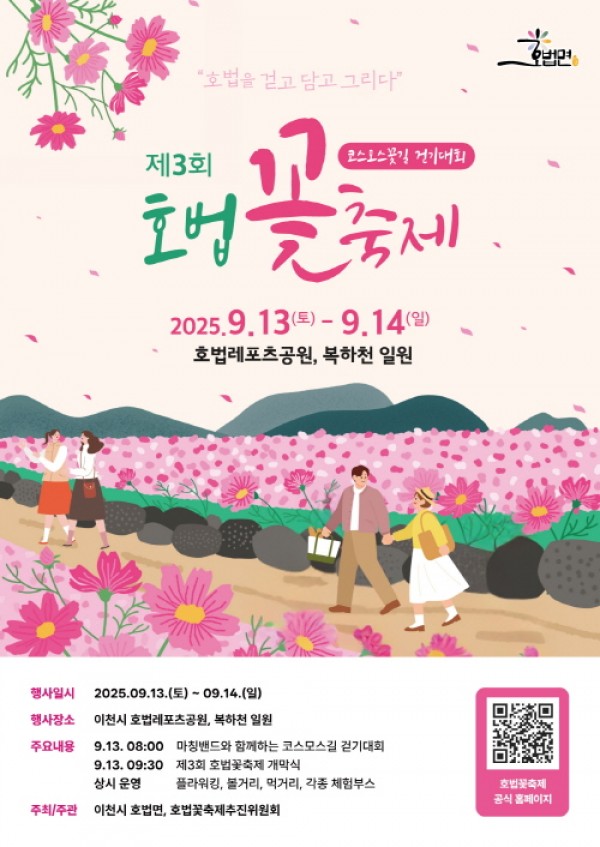 이천시 호법면(면장 윤정환)은 오는 9월 13일(토)부터 14일(일)까지 이틀간 호법레포츠공원과 복하천 일원에서 ‘제3회 호법꽃축제’를 개최한다.3. 이천시 호법면 제3회 호법꽃축제 9월 13일14일 개최 올해 축제는 ‘호법을 걷고 담고 그리다’를 주제로, 복하천을 따라 조성된 코스모스 꽃길을 중심으로 다채로운 볼거리와 즐길 거리를 선보인다. 방문객들은 바람에 흔들리는 코스모스 물결 속에서 산책을 즐기며, 축제장 곳…
