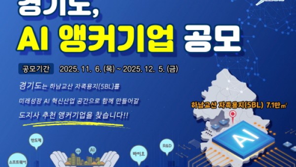 경기도가 하남교산 신도시를 인공지능(AI) 산업의 핵심 거점으로 조성하기 위해 인공지능 선도(앵커)기업을 유치하기로 하고 6일부터 12월 5일까지 공모를 진행한다.그래픽보도자료_AI+앵커기업+공모이번 공모는 경기도가 지난 1월 ‘택지개발 업무처리지침’ 개정으로 도지사의 기업용지 추천권을 확보한 이후 최초로 추진하는 내용이다.공모 대상 부지인 하남교산 자족용지(5BL)는 교산지구 전체 631만㎡ 중 7만 1,443㎡ 규모(약 1…