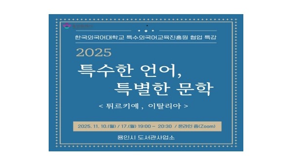 용인특례시(시장 이상일)는 11월 10일과 17일 온라인 줌을 통해 시민을 위한 온라인 인문학 강연 ‘특수한 언어, 특별한 문학’을 운영한다고 3일 밝혔다.용인특례시, 온라인 인문학 ‘특수한 언어, 특별한 문학’ 강연이번 강연은 한국외국어대학교 특수외국어교육진흥원과 협업한 프로그램으로 평소 접하기 어려운 튀르키예어와 이탈리아어권 문학을 통한 언어와 문화의 다양성을 탐구할 수 있는 자리다.첫 강연은 10일에 이난아 한국외대 튀르…