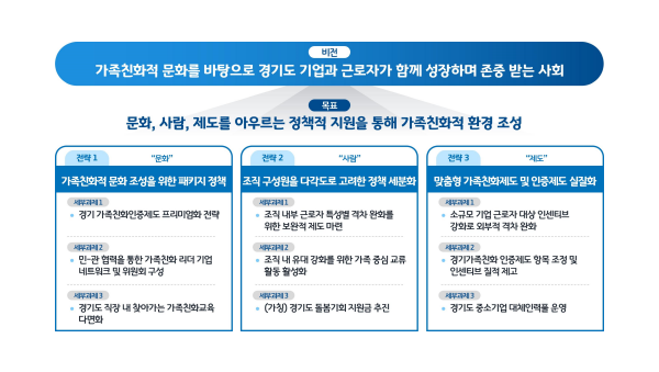 가족친화문화가 기업경영의 새로운 패러다임으로 자리 잡는 가운데, 경기연구원이 ‘경기도 민간기업 가족친화제도 개선방안’을 발간하고 가족친화제도 개선을 위한 세부 실천과제를 제시했다. 경기도+민간기업+가족친화제도+개선방안경기도는 2022년 기준 전국 민간기업 4개 중 1개가 위치한 만큼 가족친화제도를 활용한 일과 가족생활 양립, 저출산과 돌봄 위기 해소 필요성이 타 지자체보다 높은 상황이다. 공공기관과 대기업…