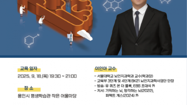 용인특례시(시장 이상일)는 9월 18일 열리는 ‘2025년 3회 퇴근길학당’ 강사로 서울대학교 뇌인지과학과 이인아 교수를 초청했다고 29일 밝혔다.용인특례시 서울대학교 뇌인지 과학과 이인아 교수 특강 안내 포스터이인아 교수는 뇌과학 분야의 권위자로 관공서와 기업에서 뇌과학 관련 강의를 진행하며 뇌 기능과 학습, 의사결정 과정에 대한 전문 지식을 전달해 왔다. 대표 저서로는 ‘기억하는 뇌, 망각하는 뇌’, ‘퍼펙트 게스’ 등이 …
