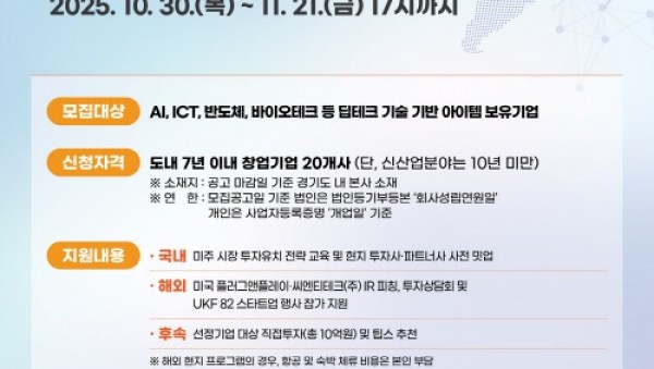 경기도와 경기도경제과학진흥원은 ‘2025년 경기 스타트업 글로벌 성장지원 샌프란시스코 투자유치 지원 프로그램’에 참여할 기업을 오는 21일까지 모집한다.샌프란시스코+모집+포스터이 사업은 미국 진출을 희망하는 우수 기술력을 갖춘 경기도 스타트업을 대상으로 투자유치 역량 강화 컨설팅을 제공…