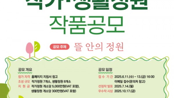 경기도는 오는 10월 평택시 농업생태원에서 열리는 ‘제13회 경기정원문화박람회’에 전시될 작가정원 및 생활정원 작품을 6월 11일부터 13일까지 공개모집한다. 공모+포스터 올해 공모 주제는 ‘뜰 안의 정원’으로, 박람회 전체 주제인 ‘평택의 뜰, 일상에서 정원을 만나…