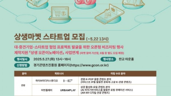 경기도와 경기콘텐츠진흥원은 새싹기업(스타트업) 판로 개척과 대·중견기업 협업을 지원하는 ‘2025년 상생마켓’ 참여기업을 모집한다. 2025+상생마켓+포스터 ‘상생마켓’은 콘텐츠 분야 새싹기업에서 개발/연구/제작해온 주력분야, 역량을 실제 시장에서 활용할 수 있도록 판…
