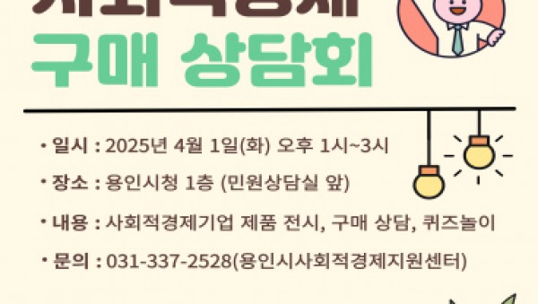 용인특례시(시장 이상일)는 4월 1일 오후 1시부터 3시까지 용인시청 로비에서 ‘찾아가는 사회적경제 구매 상담회’를 개최한다고 28일 밝혔다.찾아가는 우선구매 상담회 안내문 이번 상담회에선 사회적경제 기업의 판로 확대를 지원하고자 사회적경제 기업의 다양한 제품을 전시…
