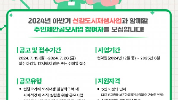 용인특례시(시장 이상일)는 ‘2024년 하반기 신갈오거리 도시재생 주민제안 공모사업’에 참여할 주민을 7월 15일부터 26일까지 모집한다.주민제안공모사업 홍보 포스터 공모사업은 주민의 직접 참여와 교류를 통해 지역 공동체 모델을 구축하고, 이를 바탕으로 지속가능한 도…