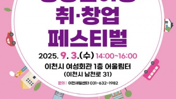 이천여성새로일하기센터(이하 새일센터)는 9월 3일(수) 어린이도서관 1층 어울림터와 여성회관 앞 야외공간에서‘중·장년 여성 취·창업 페스티벌’을 개최한다.1. 이천여성새로일하기센터 중장년 여성 취창업 페스티벌 개최 이날 행사에서는 이천시 관내 18개 기업이 참여하는 현장 채용…