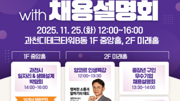 경기도와 경기도일자리재단, 과천시는 중장년층의 재취업과 인생 2막 설계를 지원하기 위해 오는 25일 과천디테크타워에서 ‘2025 과천시 일자리&생애설계박람회’와 ‘경기도 5070 일자리박람회 with 앙코르 인생특강·채용설명회’를 연계 개최한다.[사진자료]+경기도5070일자리박람…