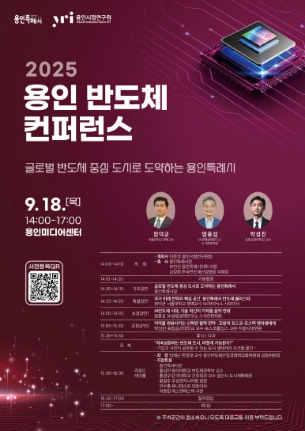 용인특례시(시장 이상일)는 재단법인 용인시정연구원과 함께 18일 오후 2시 용인미디어센터에서 ‘2025 용인 반도체 컨퍼런스’를 연다고 11일 밝혔다. 용인특례시 '2025 용인 반도체 컨퍼런스' 포스터시는 반도체 산업의 글로벌 경쟁력 강화 방안을 모색하고, 산·학·연·관 네트워크를 확대해 지역 균형 발전과 국가 산업 경쟁력을 높이기 위해 이번 컨퍼런스를 마련했다. 컨퍼런스에서는 ‘글로벌 반도체 중심도시로 도…